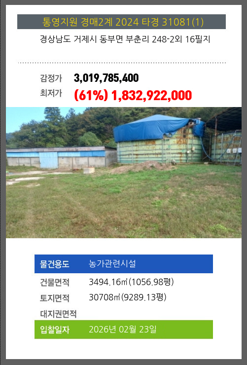 사건번호 2024 타경 31081(1) 본건은 경상남도 거제시 동부면 부춘리 248-2외 16필지소재하는 농가관련시설경매 물건의 포스팅입니다. 건물면적 [ 3494.16㎡ (1056.98평) ]토지면적 [ 30708㎡ (9289.13평) ] 시세를 반영한