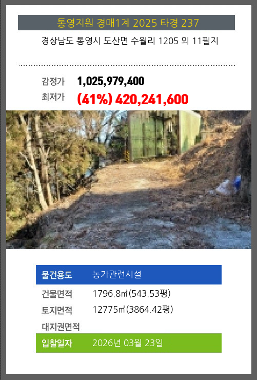 사건번호 2025 타경 237 본건은 경상남도 통영시 도산면 수월리 1205 외 11필지소재하는 농가관련시설경매 물건의 포스팅입니다. 건물면적 [ 1796.8㎡ (543.53평) ]토지면적 [ 12775㎡ (3864.42평) ] 시세를
