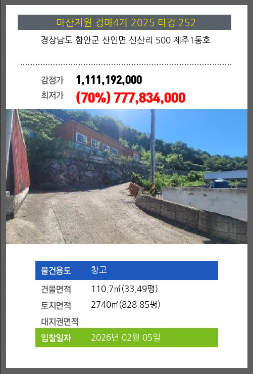 사건번호 2025 타경 252 본건은 경상남도 함안군 산인면 신산리 500 제주1동호소재하는 창고경매 물건의 포스팅입니다. 건물면적 [ 110.7㎡ (33.49평) ]토지면적 [ 2740㎡ (828.85평) ] 시세를 반영한