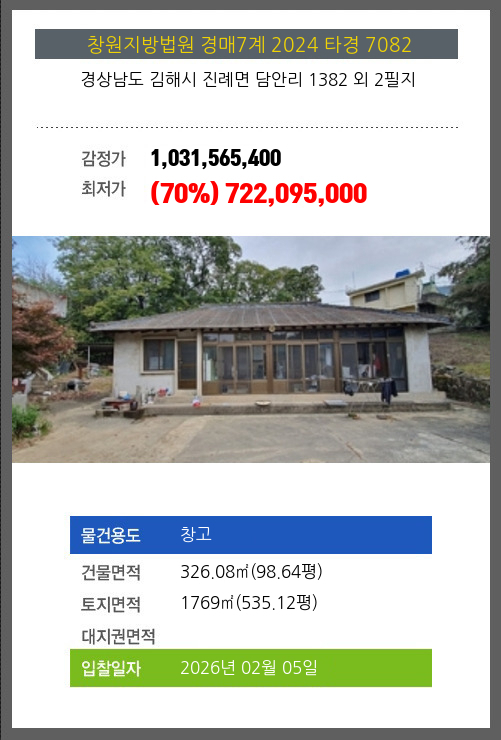 사건번호 2024 타경 7082 본건은 경상남도 김해시 진례면 담안리 1382 외 2필지소재하는 창고경매 물건의 포스팅입니다. 건물면적 [ 326.08㎡ (98.64평) ]토지면적 [ 1769㎡ (535.12평) ] 시세를