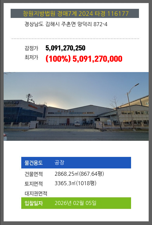 사건번호 2024 타경 116177 본건은 경상남도 김해시 주촌면 망덕리 872-4소재하는 공장경매 물건의 포스팅입니다. 건물면적 [ 2868.25㎡ (867.64평) ]토지면적 [ 3365.3㎡ (1018평) ] 시세를 반영한 감정가