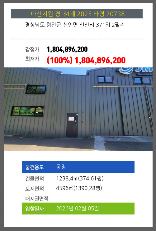 사건번호 2025 타경 20738 본건은 경상남도 함안군 산인면 신산리 371외 2필지소재하는 공장경매 물건의 포스팅입니다. 건물면적 [ 1238.4㎡ (374.61평) ]토지면적 [ 4596㎡ (1390.28평) ] 시세를 반영한