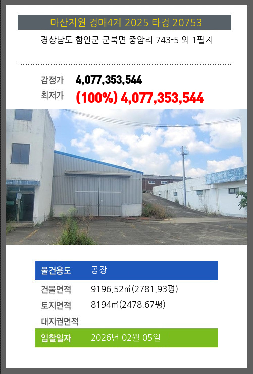 사건번호 2025 타경 20753 본건은 경상남도 함안군 군북면 중암리 743-5 외 1필지소재하는 공장경매 물건의 포스팅입니다. 건물면적 [ 9196.52㎡ (2781.93평) ]토지면적 [ 8194㎡ (2478.67평) ] 시세를
