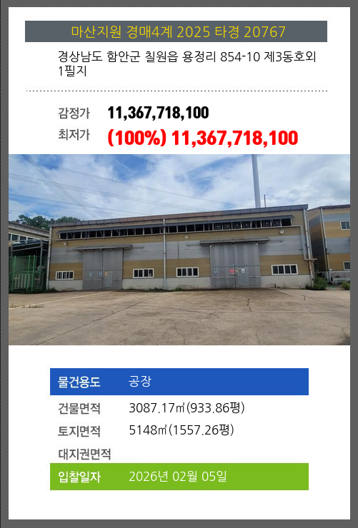 사건번호 2025 타경 20767 본건은 경상남도 함안군 칠원읍 용정리 854-10 제3동호외 1필지소재하는 공장경매 물건의 포스팅입니다. 건물면적 [ 3087.17㎡ (933.86평) ]토지면적 [ 5148㎡ (1557.26평) ] 시세를