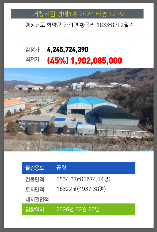 사건번호 2024 타경 1239 본건은 경상남도 함양군 안의면 황곡리 1833-8외 2필지소재하는 공장경매 물건의 포스팅입니다. 건물면적 [ 5534.37㎡ (1674.14평) ]토지면적 [ 16322㎡ (4937.38평) ] 시세를 반영한