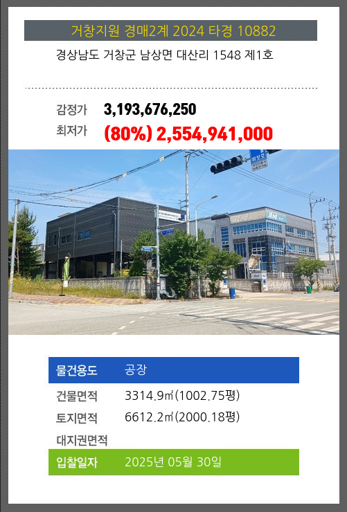 사건번호 2024 타경 10882 본건은 경상남도 거창군 남상면 대산리 1548 제1호소재하는 공장경매 물건의 포스팅입니다. 건물면적 [ 3314.9㎡ (1002.75평) ]토지면적 [ 6612.2㎡ (2000.18평) ] 시세를 반영한