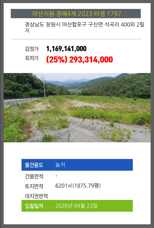 사건번호 2023 타경 1797 본건은 경상남도 창원시 마산합포구 구산면 석곡리 400외 2필지소재하는 농지경매 물건의 포스팅입니다. 토지면적 [ 6201㎡ (1875.79평) ] 시세를 반영한 감정가 1,169,141,000에서4회 유찰되어