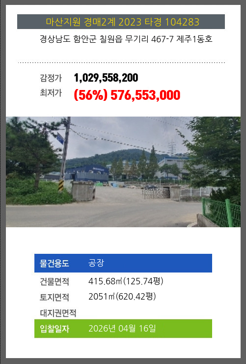 사건번호 2023 타경 104283 본건은 경상남도 함안군 칠원읍 무기리 467-7 제주1동호소재하는 공장경매 물건의 포스팅입니다. 건물면적 [ 415.68㎡ (125.74평) ]토지면적 [ 2051㎡ (620.42평) ] 시세를 반영한