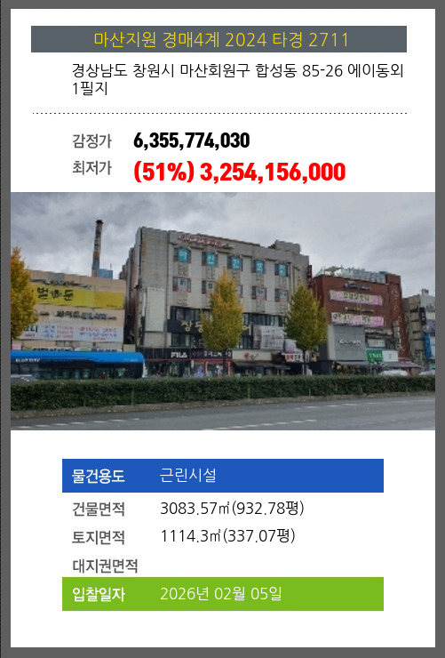 사건번호 2024 타경 2711 본건은 경상남도 창원시 마산회원구 합성동 85-26 에이동외 1필지소재하는 근린시설경매 물건의 포스팅입니다. 건물면적 [ 3083.57㎡ (932.78평) ]토지면적 [ 1114.3㎡ (337.07평) ] 시세를