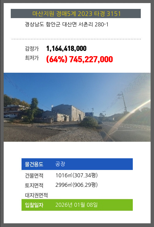 사건번호 2023 타경 3151 본건은 경상남도 함안군 대산면 서촌리 280-1소재하는 공장경매 물건의 포스팅입니다. 건물면적 [ 1016㎡ (307.34평) ]토지면적 [ 2996㎡ (906.29평) ] 시세를 반영한 감정가