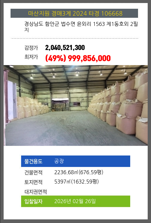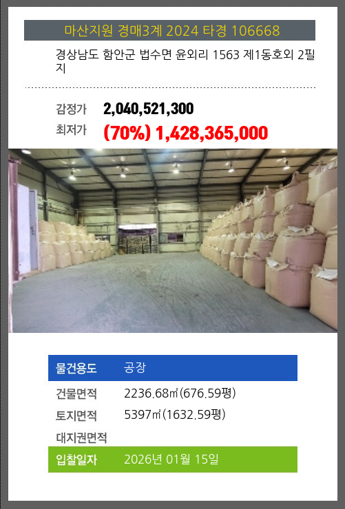 사건번호 2024 타경 106668 본건은 경상남도 함안군 법수면 윤외리 1563 제1동호외 2필지소재하는 공장경매 물건의 포스팅입니다. 건물면적 [ 2236.68㎡ (676.59평) ]토지면적 [ 5397㎡ (1632.59평) ] 시세를