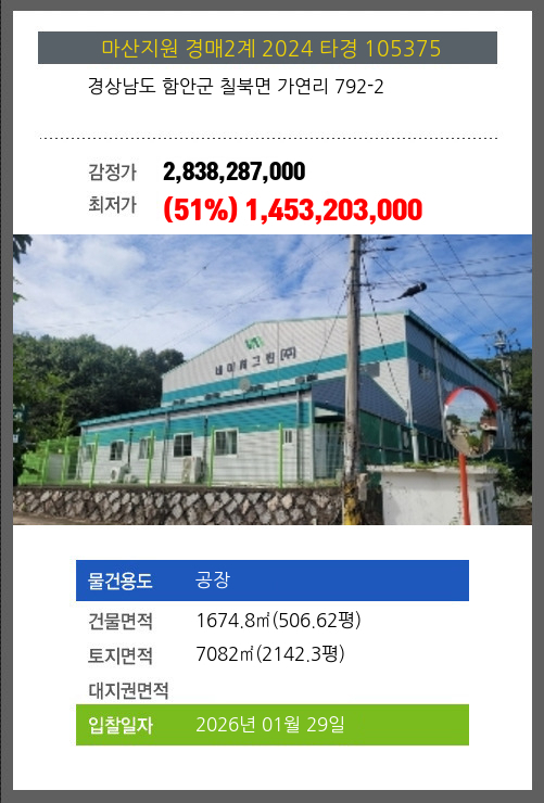 사건번호 2024 타경 105375 본건은 경상남도 함안군 칠북면 가연리 792-2소재하는 공장경매 물건의 포스팅입니다. 건물면적 [ 1674.8㎡ (506.62평) ]토지면적 [ 7082㎡ (2142.3평) ] 시세를 반영한 감정가