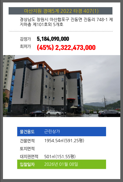 사건번호 2022 타경 407 본건은 경상남도 창원시 마산합포구 진동면 진동리 748-1 제지하층 제101호외 5개호소재하는 근린상가경매 물건의 포스팅입니다. 건물면적 [ 1954.54㎡ (591.25평) ]대지권 [ 501㎡ (151.55평)
