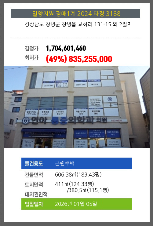 사건번호 2024 타경 3188 본건은 경상남도 창녕군 창녕읍 교하리 131-15 외 2필지소재하는 근린주택경매 물건의 포스팅입니다. 건물면적 [ 606.38㎡ (183.43평) ]토지면적 [ 전체:411㎡ (124.33평) 매각지분:380.5㎡ (115.1평)