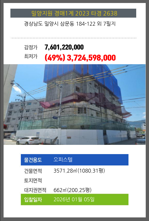사건번호 2023 타경 2638 본건은 경상남도 밀양시 삼문동 184-122 외 7필지소재하는 오피스텔경매 물건의 포스팅입니다. 건물면적 [ 3571.28㎡ (1080.31평) ]대지권 [ 662㎡ (200.25평) ] 시세를 반영한
