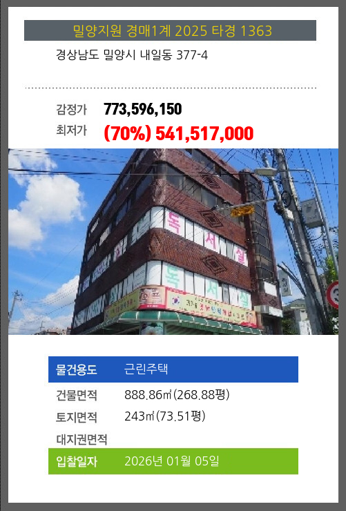 사건번호 2025 타경 1363 본건은 경상남도 밀양시 내일동 377-4소재하는 근린주택경매 물건의 포스팅입니다. 건물면적 [ 888.86㎡ (268.88평) ]토지면적 [ 243㎡ (73.51평) ] 시세를 반영한 감정가 773,596,150에서1회