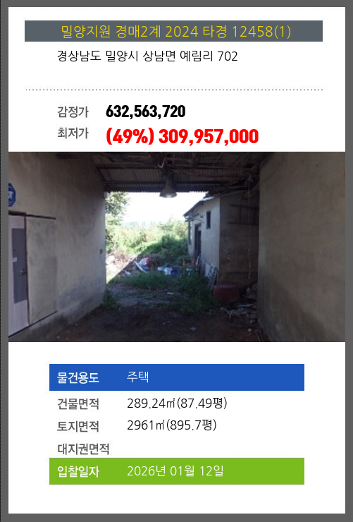 사건번호 2024 타경 12458(1) 본건은 경상남도 밀양시 상남면 예림리 702소재하는 주택경매 물건의 포스팅입니다. 건물면적 [ 289.24㎡ (87.49평) ]토지면적 [ 2961㎡ (895.7평) ] 시세를 반영한 감정가