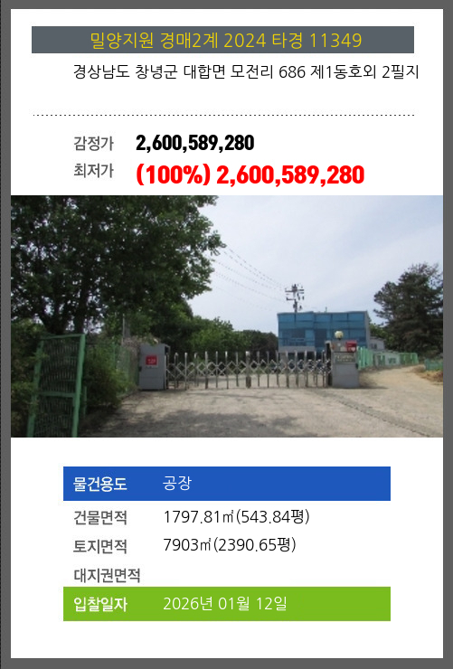 사건번호 2024 타경 11349 본건은 경상남도 창녕군 대합면 모전리 686 제1동호외 2필지소재하는 공장경매 물건의 포스팅입니다. 건물면적 [ 1797.81㎡ (543.84평) ]토지면적 [ 7903㎡ (2390.65평) ] 시세를