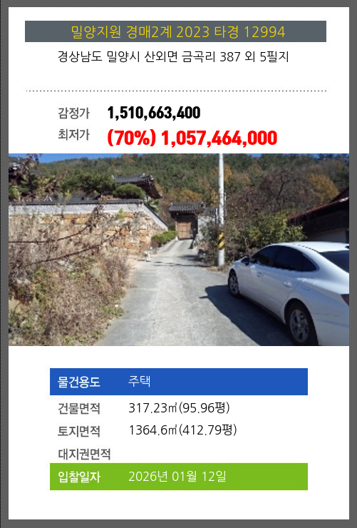 사건번호 2023 타경 12994 본건은 경상남도 밀양시 산외면 금곡리 387 외 5필지소재하는 주택경매 물건의 포스팅입니다. 건물면적 [ 317.23㎡ (95.96평) ]토지면적 [ 1364.6㎡ (412.79평) ] 시세를