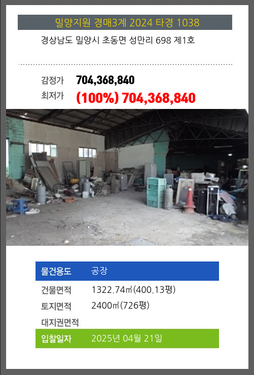 사건번호 2024 타경 1038 본건은 경상남도 밀양시 초동면 성만리 698 제1호소재하는 공장경매 물건의 포스팅입니다. 건물면적 [ 1322.74㎡ (400.13평) ]토지면적 [ 2400㎡ (726평) ] 시세를 반영한