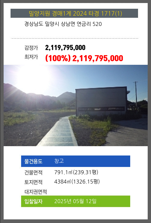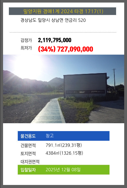 사건번호 2024 타경 1717(1) 본건은 경상남도 밀양시 상남면 연금리 520소재하는 창고경매 물건의 포스팅입니다. 건물면적 [ 791.1㎡ (239.31평) ]토지면적 [ 4384㎡ (1326.15평) ] 시세를 반영한 감정가