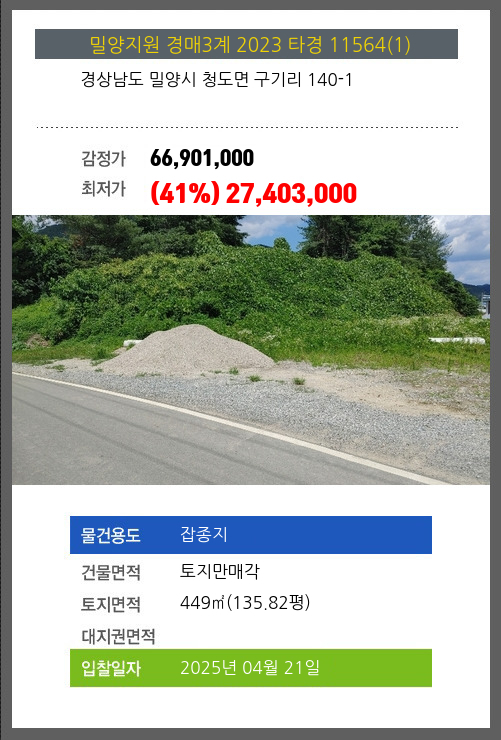 사건번호 2023 타경 11564(1) 본건은 경상남도 밀양시 청도면 구기리 140-1소재하는 잡종지경매 물건의 포스팅입니다. 건물면적 [ 토지만매각 ]토지면적 [ 449㎡ (135.82평) ] 시세를 반영한 감정가 66,901,000에서4회