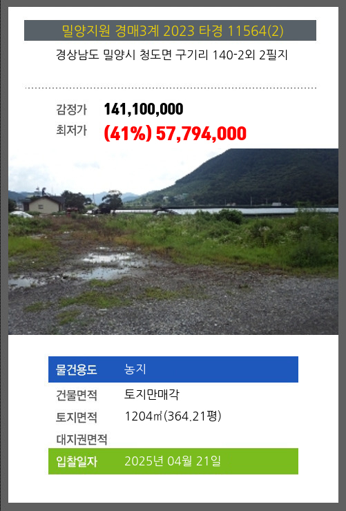 사건번호 2023 타경 11564(2) 본건은 경상남도 밀양시 청도면 구기리 140-2외 2필지소재하는 농지경매 물건의 포스팅입니다. 건물면적 [ 토지만매각 ]토지면적 [ 1204㎡ (364.21평) ] 시세를 반영한 감정가