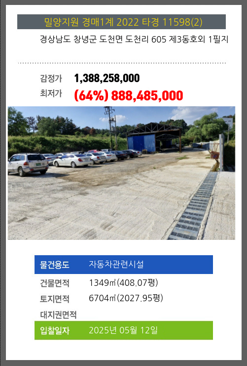 사건번호 2022 타경 11598(2) 본건은 경상남도 창녕군 도천면 도천리 605 제3동호외 1필지소재하는 자동차관련시설경매 물건의 포스팅입니다. 건물면적 [ 1349㎡ (408.07평) ]토지면적 [ 6704㎡ (2027.95평) ] 시세를