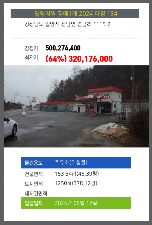 사건번호 2024 타경 134 본건은 경상남도 밀양시 상남면 연금리 1115-2소재하는 주유소(위험물)경매 물건의 포스팅입니다. 건물면적 [ 153.34㎡ (46.39평) ]토지면적 [ 1250㎡ (378.12평) ] 시세를 반영한 감정가