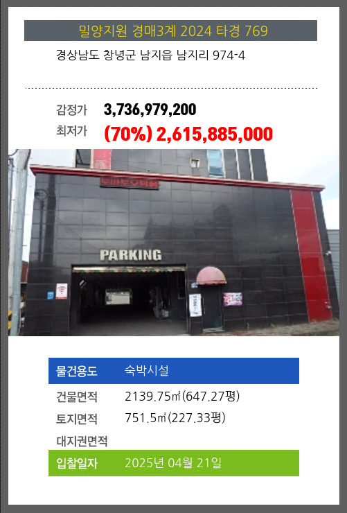 사건번호 2024 타경 769 본건은 경상남도 창녕군 남지읍 남지리 974-4소재하는 숙박시설경매 물건의 포스팅입니다. 건물면적 [ 2139.75㎡ (647.27평) ]토지면적 [ 751.5㎡ (227.33평) ] 시세를 반영한 감정가