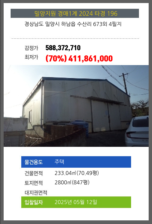 사건번호 2024 타경 196 본건은 경상남도 밀양시 하남읍 수산리 673외 4필지소재하는 주택경매 물건의 포스팅입니다. 건물면적 [ 233.04㎡ (70.49평) ]토지면적 [ 2800㎡ (847평) ] 시세를 반영한