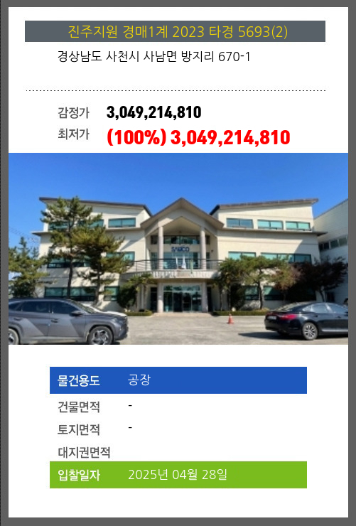사건번호 2023 타경 5693(2) 본건은 경상남도 사천시 사남면 방지리 670-1소재하는 공장경매 물건의 포스팅입니다. 시세를 반영한 감정가 3,049,214,810에서신건으로 감정가 대비 100%최저가 3,049,214,810부터입찰에 참여할 수 있습니다. 입찰보증금은