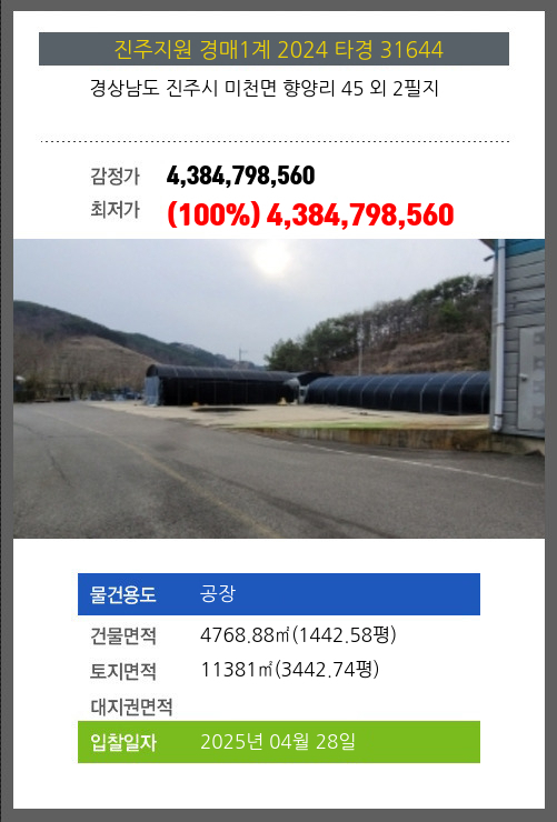 사건번호 2024 타경 31644 본건은 경상남도 진주시 미천면 향양리 45 외 2필지소재하는 공장경매 물건의 포스팅입니다. 건물면적 [ 4768.88㎡ (1442.58평) ]토지면적 [ 11381㎡ (3442.74평) ] 시세를