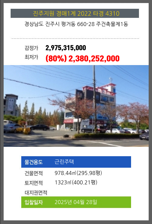 사건번호 2022 타경 4310 본건은 경상남도 진주시 평거동 660-28 주건축물제1동소재하는 근린주택경매 물건의 포스팅입니다. 건물면적 [ 978.44㎡ (295.98평) ]토지면적 [ 1323㎡ (400.21평) ] 시세를 반영한 감정가