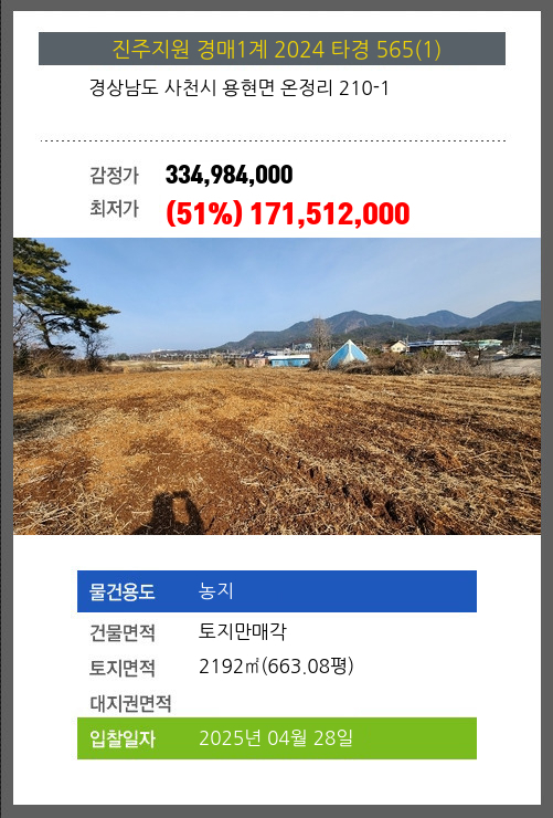 사건번호 2024 타경 565(1) 본건은 경상남도 사천시 용현면 온정리 210-1소재하는 농지경매 물건의 포스팅입니다. 건물면적 [ 토지만매각 ]토지면적 [ 2192㎡ (663.08평) ] 시세를 반영한 감정가 334,984,000에서3회