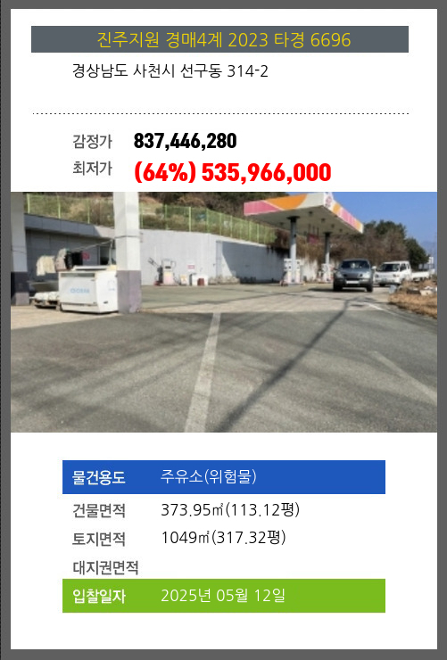 사건번호 2023 타경 6696 본건은 경상남도 사천시 선구동 314-2소재하는 주유소(위험물)경매 물건의 포스팅입니다. 건물면적 [ 373.95㎡ (113.12평) ]토지면적 [ 1049㎡ (317.32평) ] 시세를 반영한 감정가 837,446,280에서2회