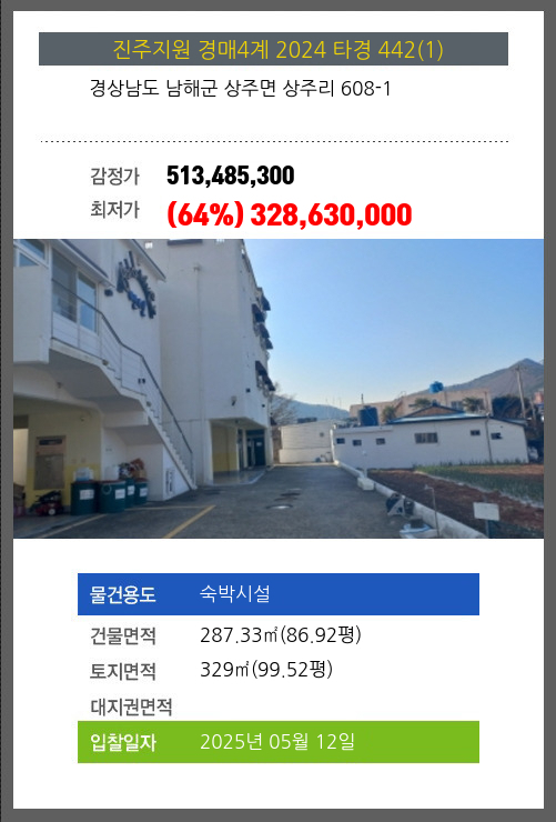 사건번호 2024 타경 442(1) 본건은 경상남도 남해군 상주면 상주리 608-1소재하는 숙박시설경매 물건의 포스팅입니다. 건물면적 [ 287.33㎡ (86.92평) ]토지면적 [ 329㎡ (99.52평) ] 시세를 반영한 감정가