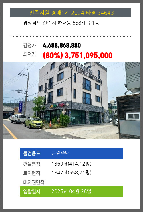 사건번호 2024 타경 34643 본건은 경상남도 진주시 하대동 658-1 주1동소재하는 근린주택경매 물건의 포스팅입니다. 건물면적 [ 1369㎡ (414.12평) ]토지면적 [ 1847㎡ (558.71평) ] 시세를 반영한 감정가