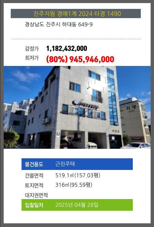 사건번호 2024 타경 1490 본건은 경상남도 진주시 하대동 649-9소재하는 근린주택경매 물건의 포스팅입니다. 건물면적 [ 519.1㎡ (157.03평) ]토지면적 [ 316㎡ (95.59평) ] 시세를 반영한 감정가 1,182,432,000에서1회
