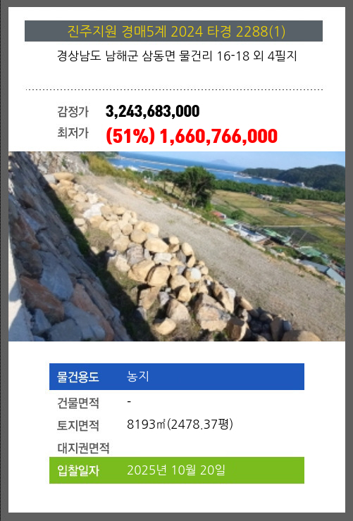 사건번호 2024 타경 2288(1) 본건은 경상남도 남해군 삼동면 물건리 16-18 외 4필지소재하는 농지경매 물건의 포스팅입니다. 토지면적 [ 8193㎡ (2478.37평) ] 시세를 반영한 감정가 3,243,683,000에서3회 유찰되어