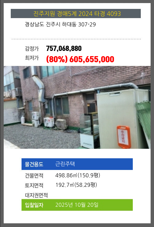 사건번호 2024 타경 4093 본건은 경상남도 진주시 하대동 307-29소재하는 근린주택경매 물건의 포스팅입니다. 건물면적 [ 498.86㎡ (150.9평) ]토지면적 [ 192.7㎡ (58.29평) ] 시세를 반영한 감정가 757,068,880에서1회