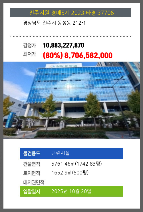 사건번호 2023 타경 37706 본건은 경상남도 진주시 동성동 212-1소재하는 근린시설경매 물건의 포스팅입니다. 건물면적 [ 5761.46㎡ (1742.83평) ]토지면적 [ 1652.9㎡ (500평) ] 시세를 반영한 감정가 10,883,227,870에서1회