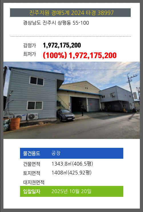 사건번호 2024 타경 38997 본건은 경상남도 진주시 상평동 55-100소재하는 공장경매 물건의 포스팅입니다. 건물면적 [ 1343.8㎡ (406.5평) ]토지면적 [ 1408㎡ (425.92평) ] 시세를 반영한 감정가 1,972,175,200에서신건으로