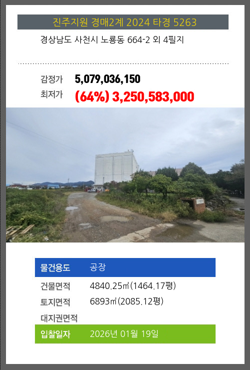 사건번호 2024 타경 5263 본건은 경상남도 사천시 노룡동 664-2 외 4필지소재하는 공장경매 물건의 포스팅입니다. 건물면적 [ 4840.25㎡ (1464.17평) ]토지면적 [ 6893㎡ (2085.12평) ] 시세를 반영한