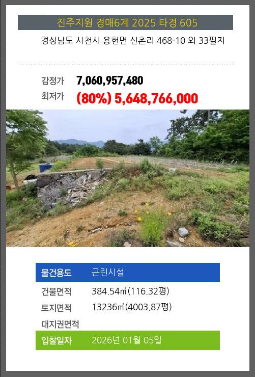 사건번호 2025 타경 605 본건은 경상남도 사천시 용현면 신촌리 468-10 외 33필지소재하는 근린시설경매 물건의 포스팅입니다. 건물면적 [ 384.54㎡ (116.32평) ]토지면적 [ 13236㎡ (4003.87평) ] 시세를