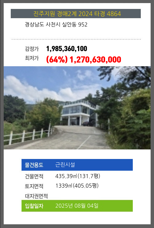 사건번호 2024 타경 4864 본건은 경상남도 사천시 실안동 952소재하는 근린시설경매 물건의 포스팅입니다. 건물면적 [ 435.39㎡ (131.7평) ]토지면적 [ 1339㎡ (405.05평) ] 시세를 반영한 감정가 1,985,360,100에서2회