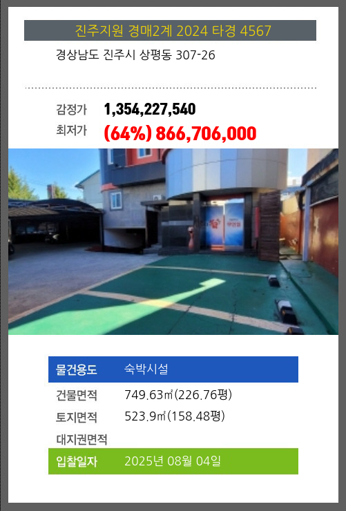 사건번호 2024 타경 4567 본건은 경상남도 진주시 상평동 307-26소재하는 숙박시설경매 물건의 포스팅입니다. 건물면적 [ 749.63㎡ (226.76평) ]토지면적 [ 523.9㎡ (158.48평) ] 시세를 반영한 감정가 1,354,227,540에서2회