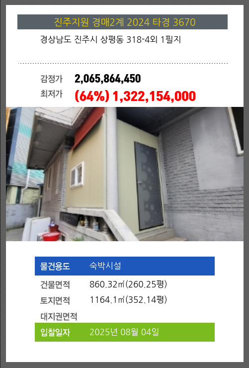 사건번호 2024 타경 3670 본건은 경상남도 진주시 상평동 318-4외 1필지소재하는 숙박시설경매 물건의 포스팅입니다. 건물면적 [ 860.32㎡ (260.25평) ]토지면적 [ 1164.1㎡ (352.14평) ] 시세를 반영한 감정가