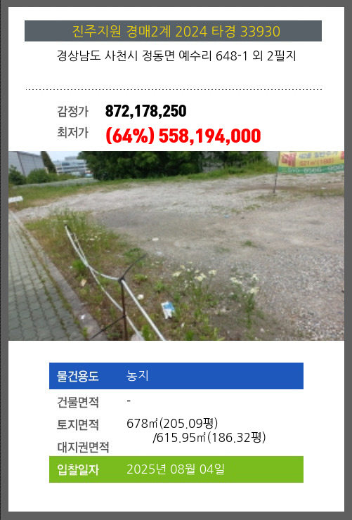 사건번호 2024 타경 33930 본건은 경상남도 사천시 정동면 예수리 648-1 외 2필지소재하는 농지경매 물건의 포스팅입니다. 토지면적 [ 전체:678㎡ (205.09평) 매각지분:615.95㎡ (186.32평) ] 시세를 반영한 감정가