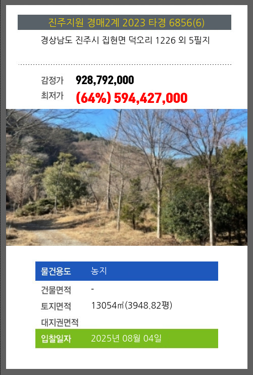 사건번호 2023 타경 6856(6) 본건은 경상남도 진주시 집현면 덕오리 1226 외 5필지소재하는 농지경매 물건의 포스팅입니다. 토지면적 [ 13054㎡ (3948.82평) ] 시세를 반영한 감정가 928,792,000에서2회 유찰되어